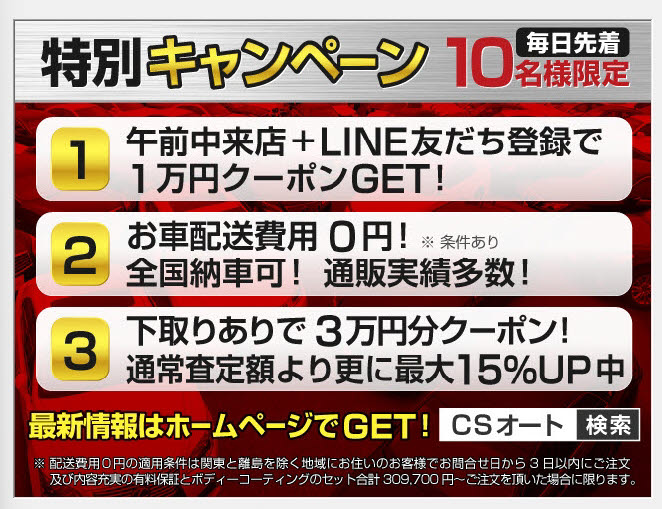 - 様々なキャンペーンや特典をご用意!午前中のご来店&LINE友達登録で1万円クーポンGETや、下取り査定最大30%UPなど盛りだくさん!